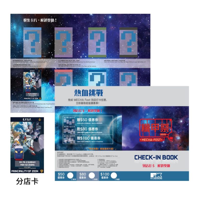 機甲祭活動期間,FX Creations 各分店化身成「到店Check-point」, 客戶只需要到達各分店打卡及拿取分店卡以完成挑戰,完成挑戰即可獲得相關任務的優惠折扣,最多可達 $100 現金折扣!
