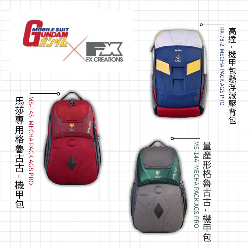 FX CREATIONS 再度攜手經典動漫《機動戰士高達》,推出全新 3D Mecha Pack 系列!本系列包含三款以經典機體為靈感的立體機甲背囊,設計上忠實還原機甲細節,並搭載品牌專利 第5代 AGS 減壓技術,將機甲科技感與日常實用性完美結合,打造既時尚又舒適的背負體驗。